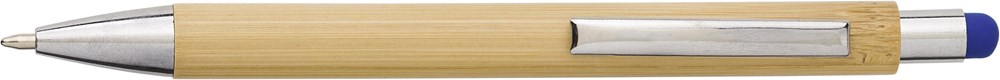 Kugelschreiber aus Bambus mit Kunststoffspitze und -oberseite, inkl. Touch-Pen. Der Clip ist aus Metall. Blaue Mine.