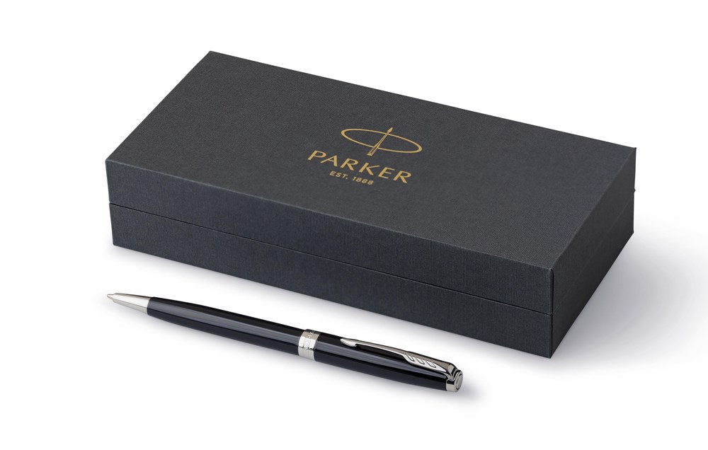 Parker Drehkugelschreiber Sonnet Schaft und Kappe aus Edelstahl, akzentuiert durch Clip und Zierleiste in Chromoptik. Schreibfarbe: schwarz. Verpackt in einer Geschenkbox.