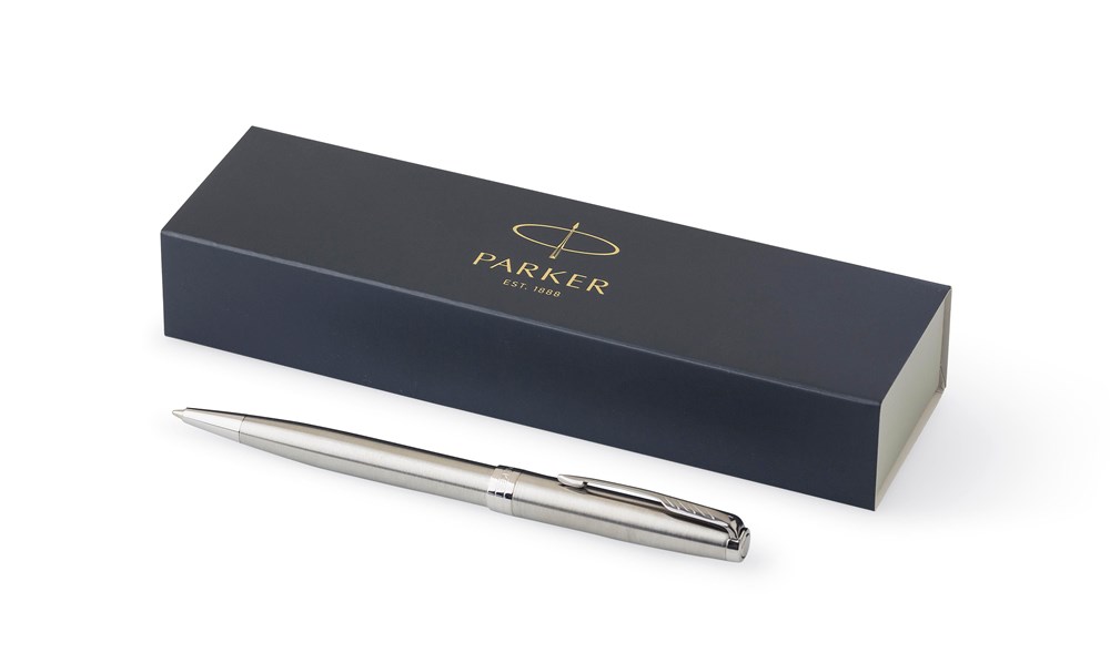 Druckkugelschreiber Parker Sonnet aus Edelstahl. Schreibfarbe: schwarz. Verpackt in einer Geschenkbox.