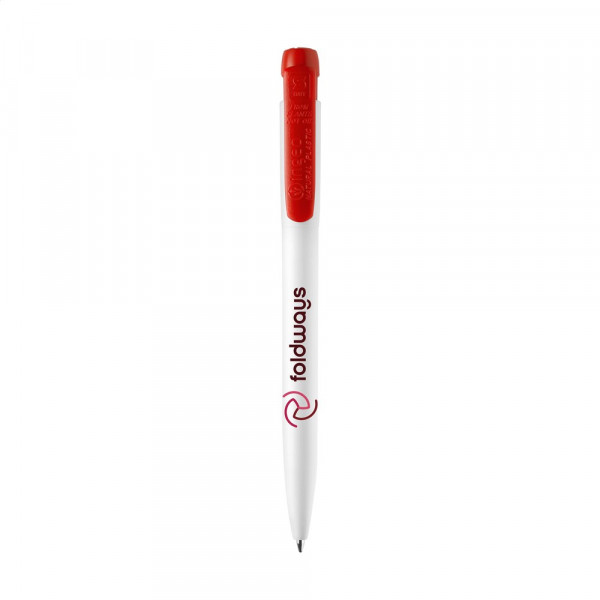 Blauschreibender Kugelschreiber der Marke Stilolinea®. Der matte Halter ist aus Ingeo® PLA-Kunststoff gefertigt. Ingeo® ist ein Kunststoff, der aus Pflanzenfasern hergestellt wird. Dadurch ist der Stift zu 80% biologisch abbaubar und kompostierbar. Außerdem benötigt die Herstellung von Stiften aus PLA nur ein Drittel der Energie im Vergleich zur Produktion von ABS-Kunststoff. Mit Ingeo-Logo auf dem farbigen Clip/Druckknopf. Made in Italy.