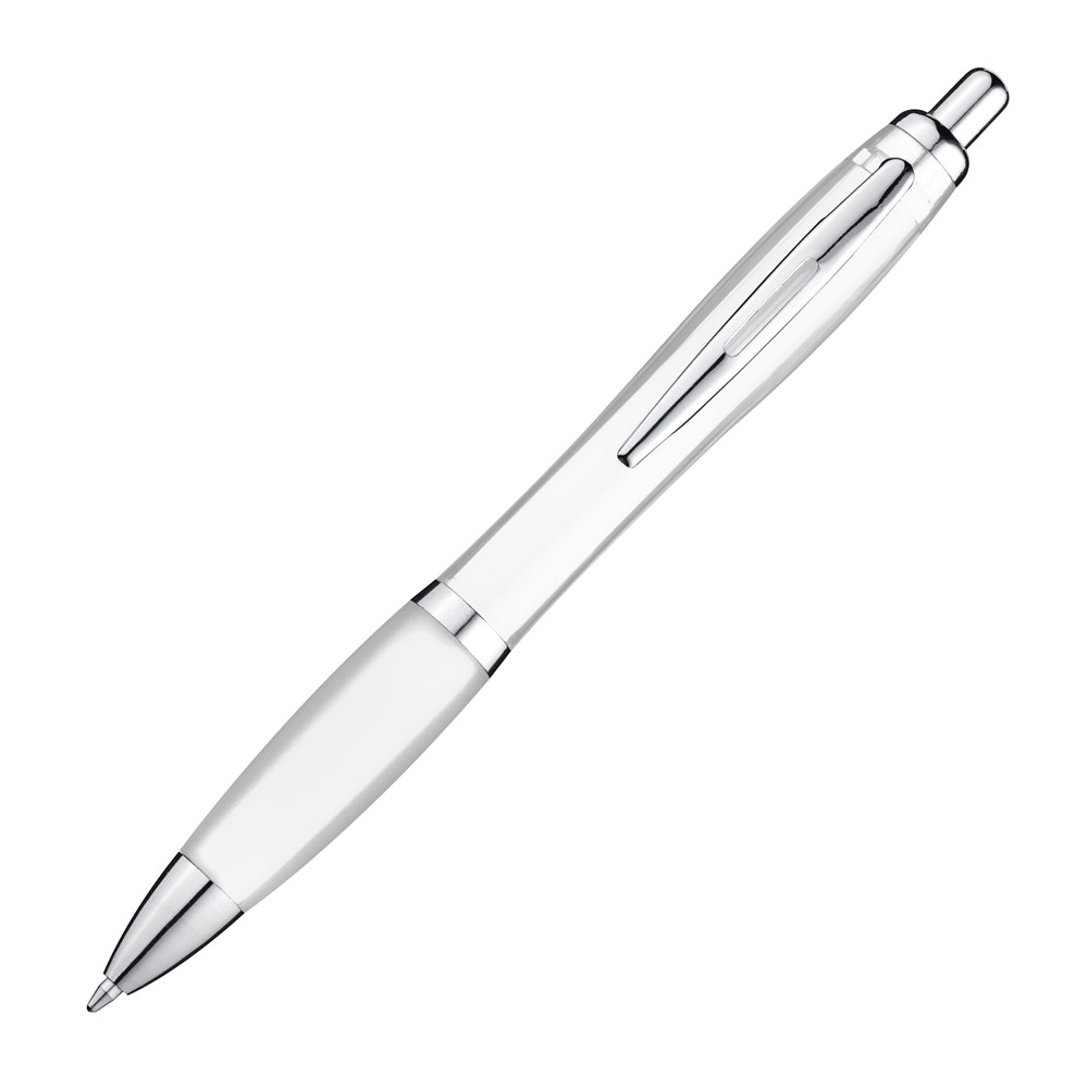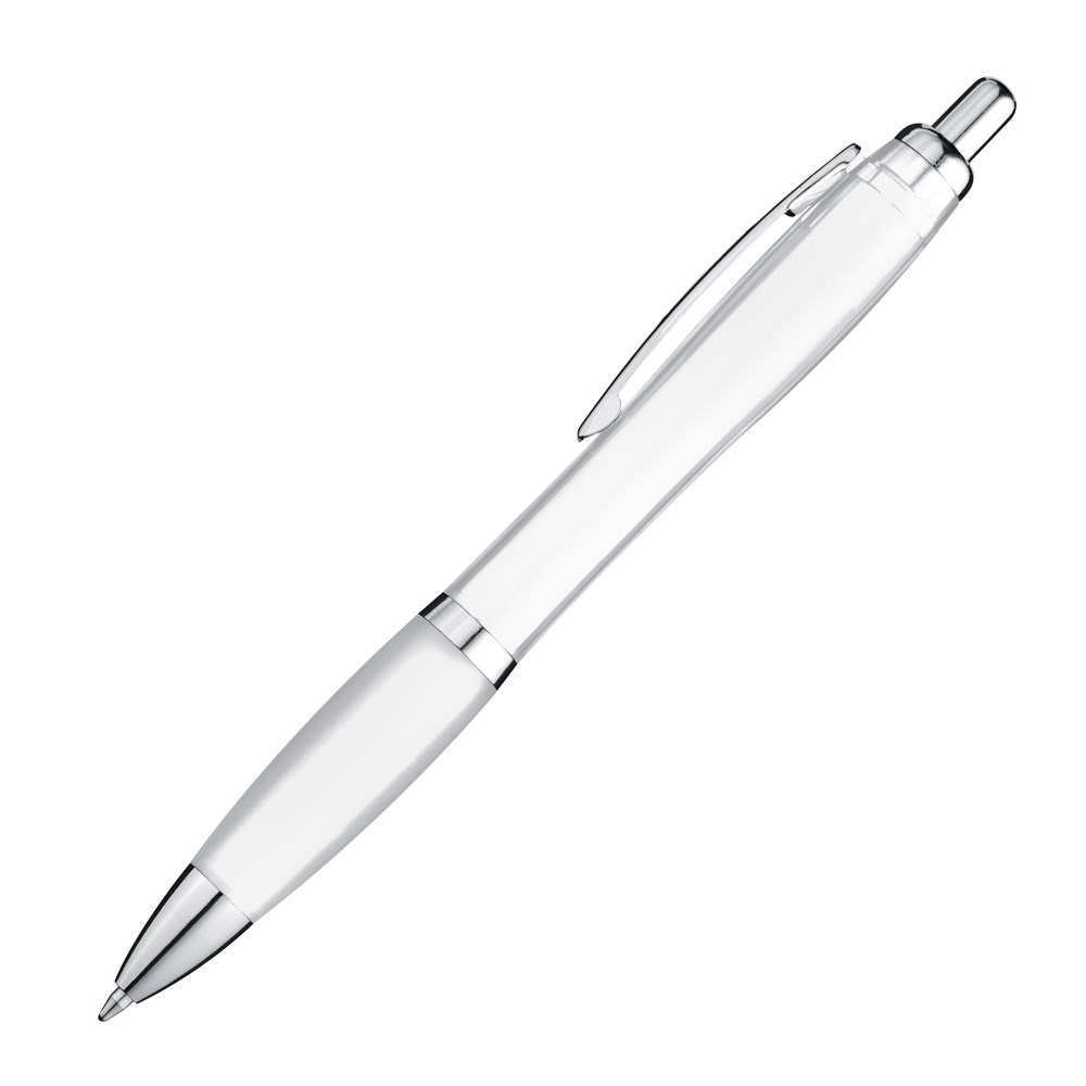 Unser transparenter Kugelschreiber mit silbernem Metallclip, Gummimanschette und blau schreibender Großraummine ist eine moderne und komfortable Schreiboption. Ihre Werbung wird auf den Schaft des Kugelschreibers rechts vom Clip gedruckt, um Ihre Marke stilvoll zu präsentieren.