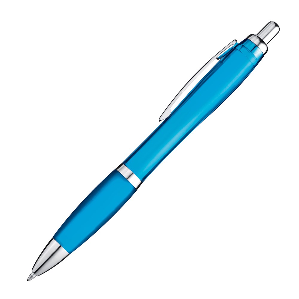 Unser transparenter Kugelschreiber mit silbernem Metallclip, Gummimanschette und blau... mehr
