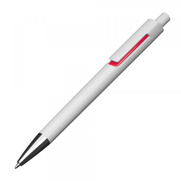 Unser Kugelschreiber mit weißem Schaft, farbigen Applikationen, blau schreibender Großraummine und extravagantem Clip bietet ein auffälliges und dennoch praktisches Schreibgerät. Ihre Werbung wird auf den Schaft des Kugelschreibers gedruckt, um sicherzustellen, dass Ihre Marke auf auffällige und stilvolle Weise präsentiert wird.