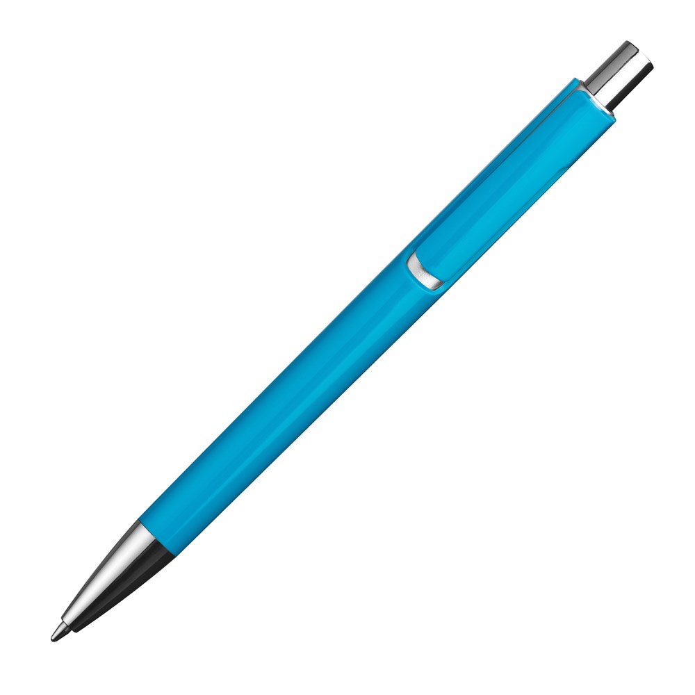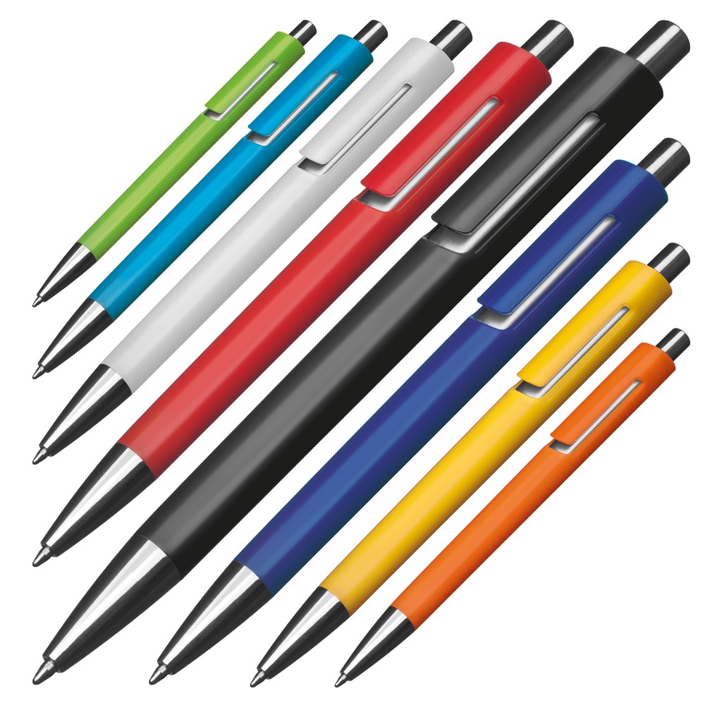 Unser Kugelschreiber mit farbigem Schaft, silbernen Applikationen, blau schreibender Großraummine und extravagantem Clip ist ein auffälliges Schreibgerät. Ihre Werbung wird auf den Schaft des Kugelschreibers gedruckt, um sicherzustellen, dass Ihre Marke auf auffällige und stilvolle Weise präsentiert wird.
