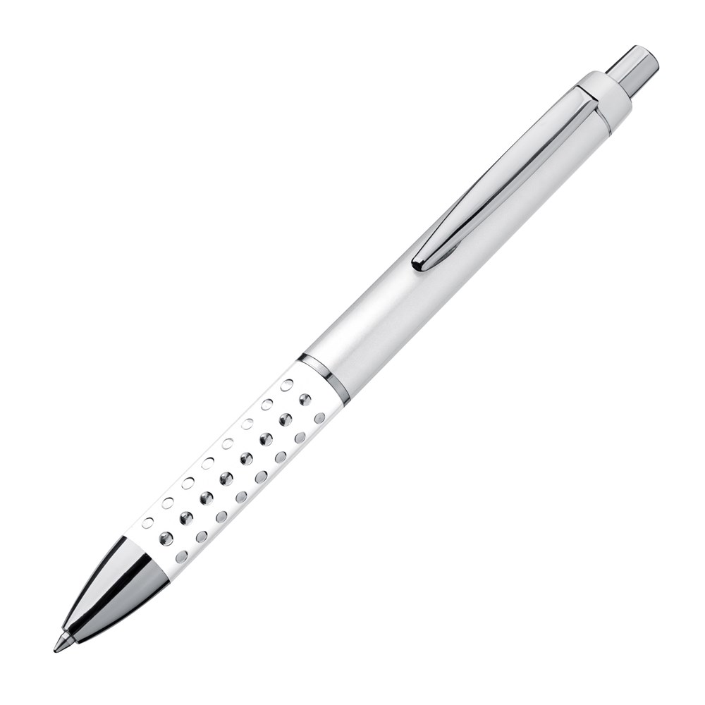 Ein Kugelschreiber mit einer glitzernden, rutschfesten Griffzone und einer blau schreibenden Großraummine ist nicht nur ein praktisches Schreibgerät, sondern auch ein auffälliger Blickfang.