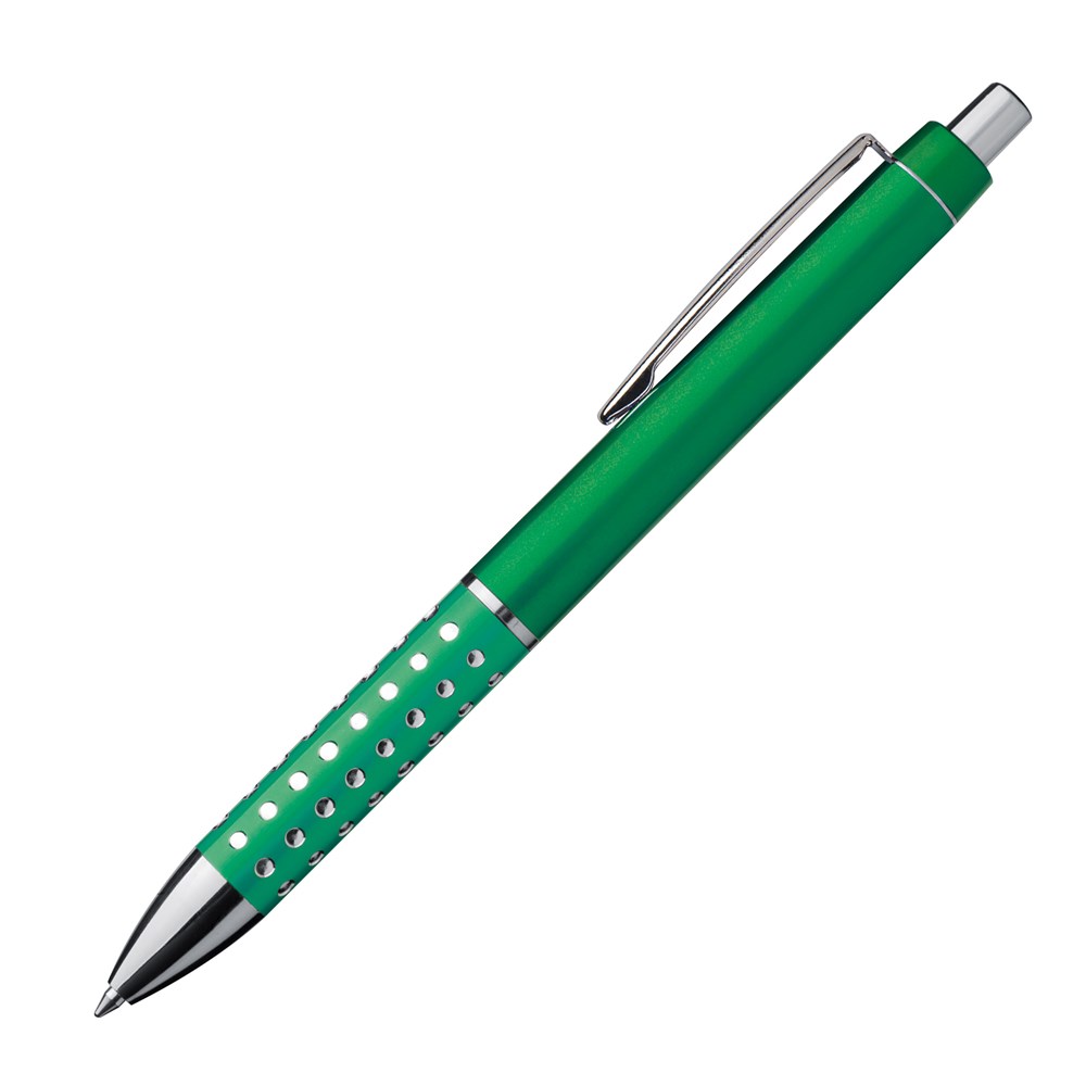 Ein Kugelschreiber mit einer glitzernden, rutschfesten Griffzone und einer blau schreibenden Großraummine ist nicht nur ein praktisches Schreibgerät, sondern auch ein auffälliger Blickfang.