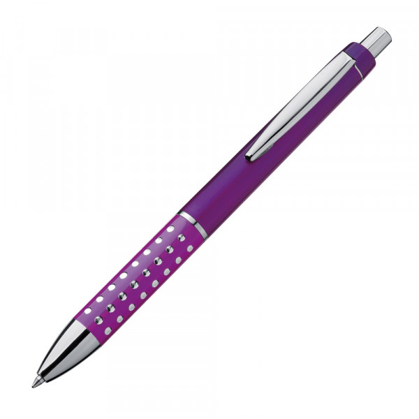Ein Kugelschreiber mit einer glitzernden, rutschfesten Griffzone und einer blau schreibenden Großraummine ist nicht nur ein praktisches Schreibgerät, sondern auch ein auffälliger Blickfang.