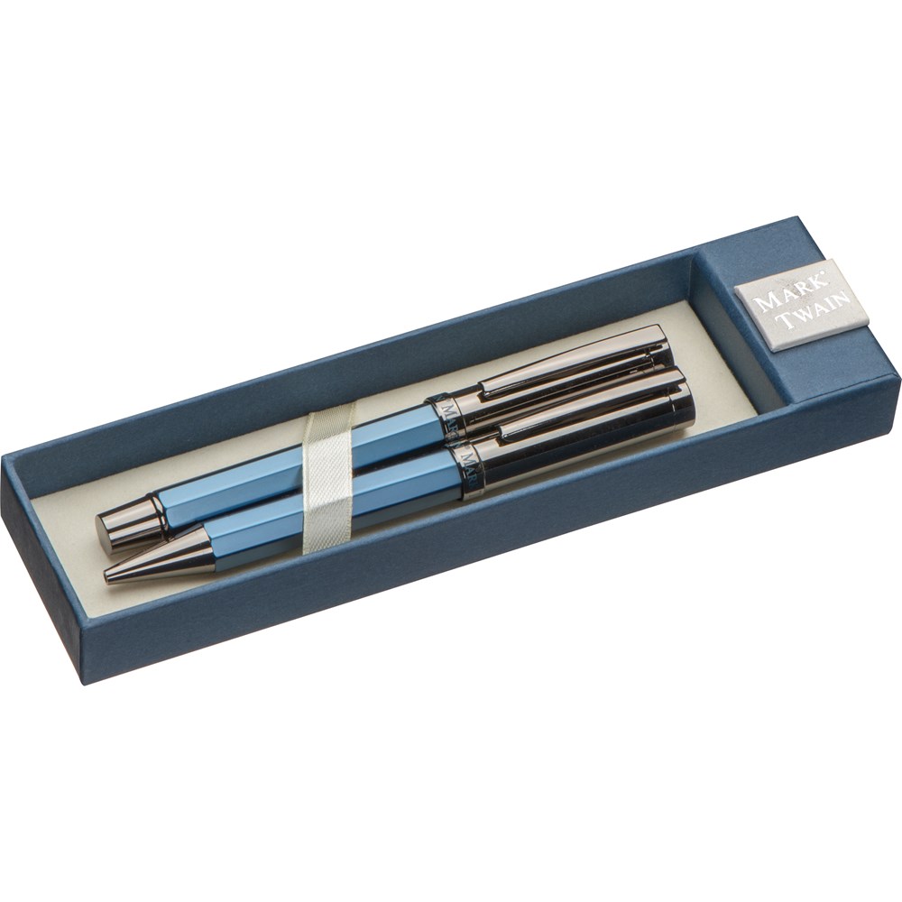 Herzlich willkommen zu unserem exklusiven Mark Twain Schreibset – eine hochwertige Kombination aus einem Rollerball und einem Kugelschreiber aus Metall mit einem eleganten dunkelblauen Finish! Beide Schreibgeräte sind mit blauer Schreibfarbe ausgestattet.