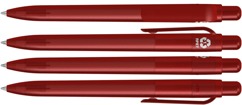 Druckkugelschreiber aus recyceltem PET-Material mit transparent gefrostetem Gehäuse, Clip, Drücker und Stopfen.