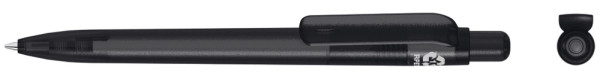 Druckkugelschreiber aus recyceltem PET-Material mit transparent gefrostetem Gehäuse, Clip, Drücker und Stopfen.