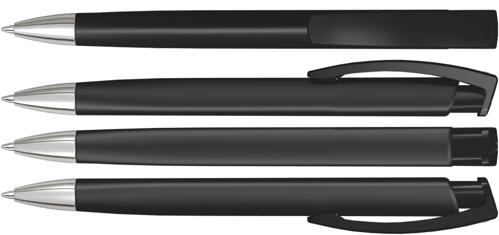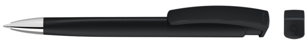 Druckkugelschreiber mit gedeckt mattem Dreikantgehäuse und glänzendem Clip aus recyceltem ABS Kunststoff, schwere Metallspitze glanzverchromt. Das Modell ist mit dem Recyclingzeichen gekennzeichnet.