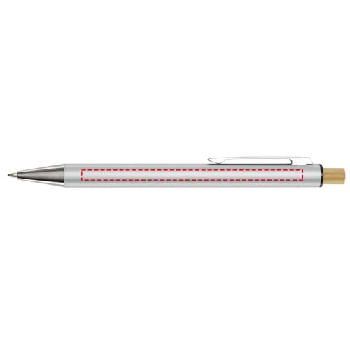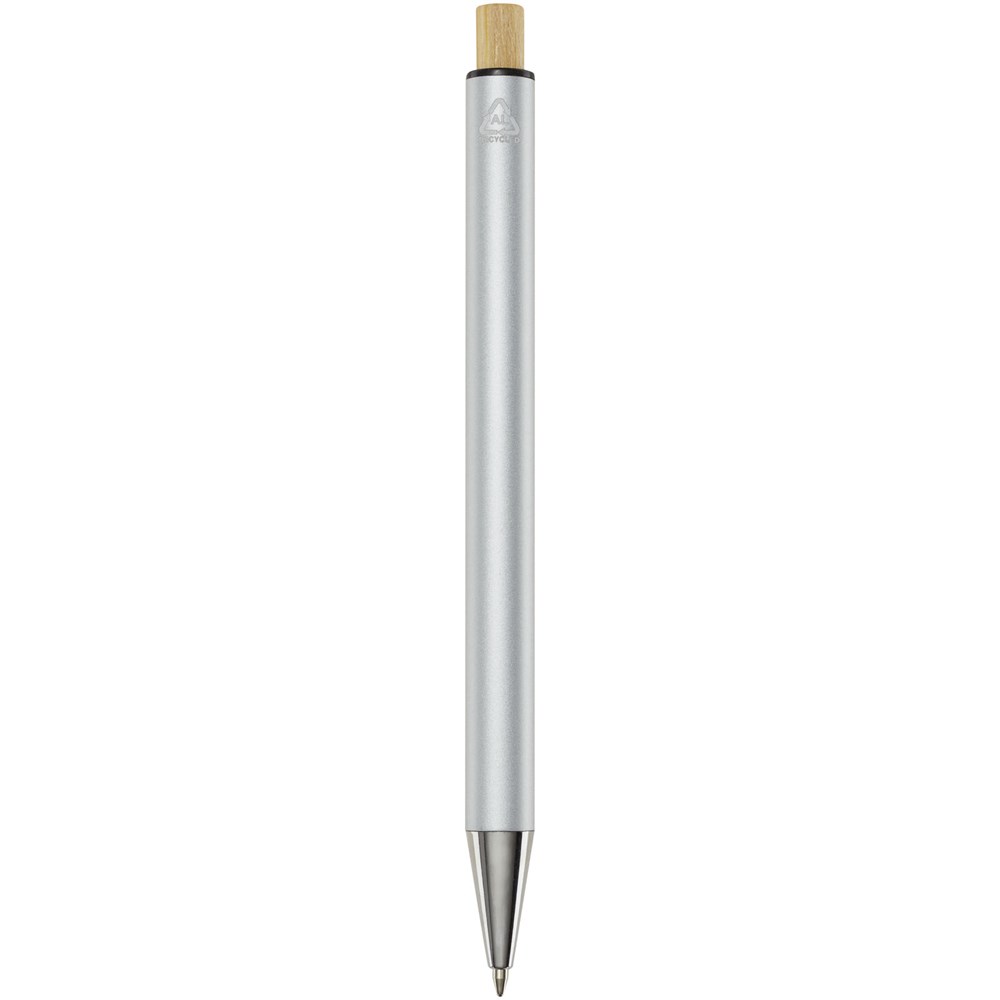 Der Cyrus Kugelschreiber ist aus recyceltem Aluminium hergestellt, was weniger Energie benötigt als die Herstellung von Aluminium aus Rohstoffen. Es reduziert außerdem die Abfallmenge auf Mülldeponien und trägt dazu bei, natürliche Ressourcen zu schonen und Treibhausgasemissionen zu reduzieren. Druckknopf ist aus Bambus gefertigt. Tintenfarbe: Blau. Schreiblänge: 800 Meter. Spitzengröße: 1,00 mm.