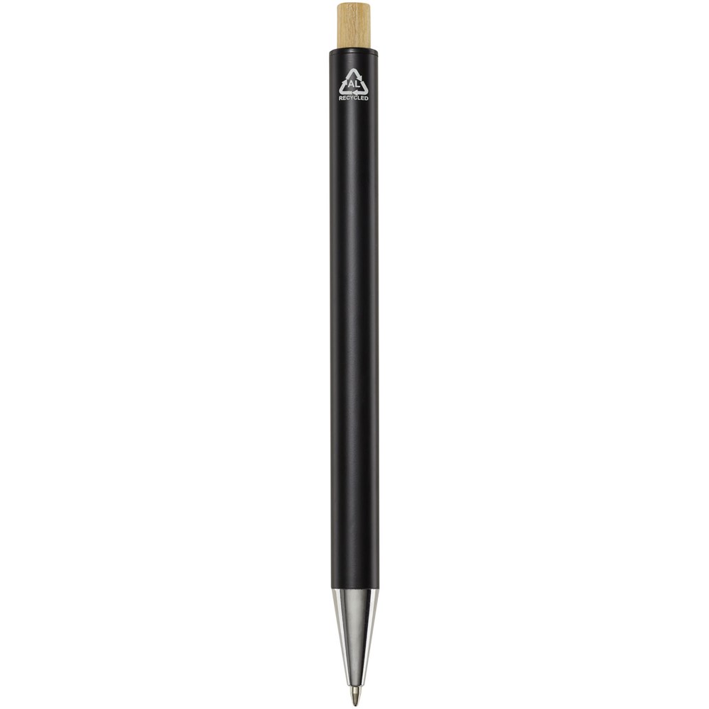 Der Cyrus Kugelschreiber ist aus recyceltem Aluminium hergestellt, was weniger Energie benötigt als die Herstellung von Aluminium aus Rohstoffen. Es reduziert außerdem die Abfallmenge auf Mülldeponien und trägt dazu bei, natürliche Ressourcen zu schonen und Treibhausgasemissionen zu reduzieren. Druckknopf ist aus Bambus gefertigt. Tintenfarbe: Blau. Schreiblänge: 800 Meter. Spitzengröße: 1,00 mm.