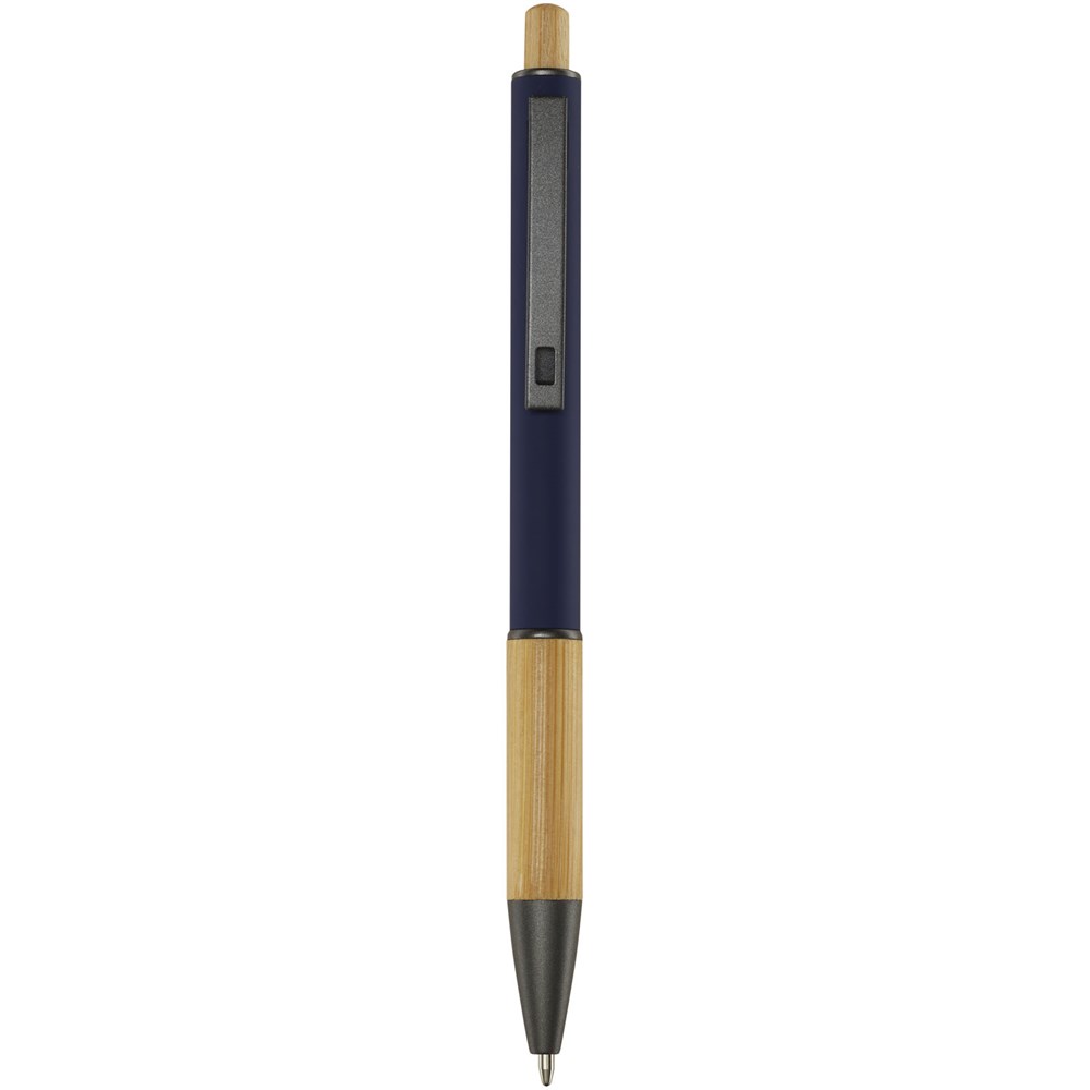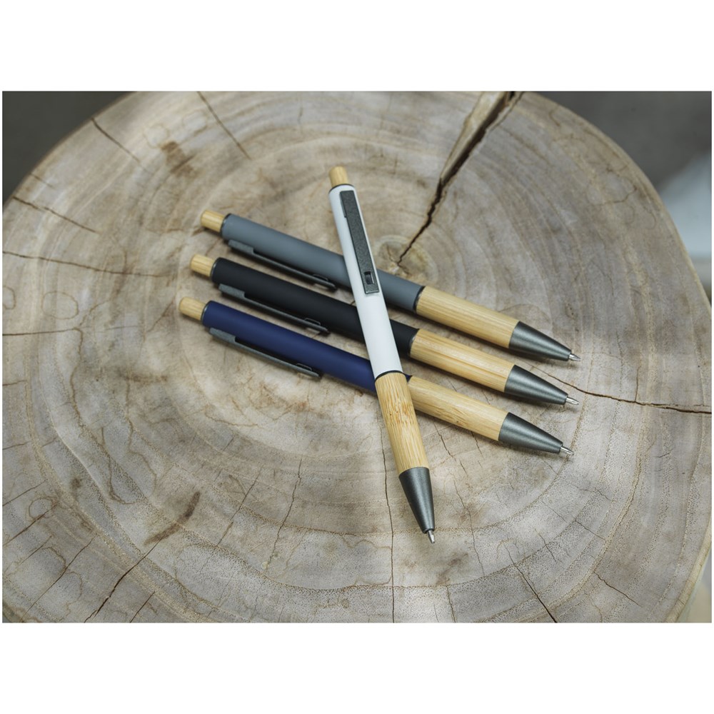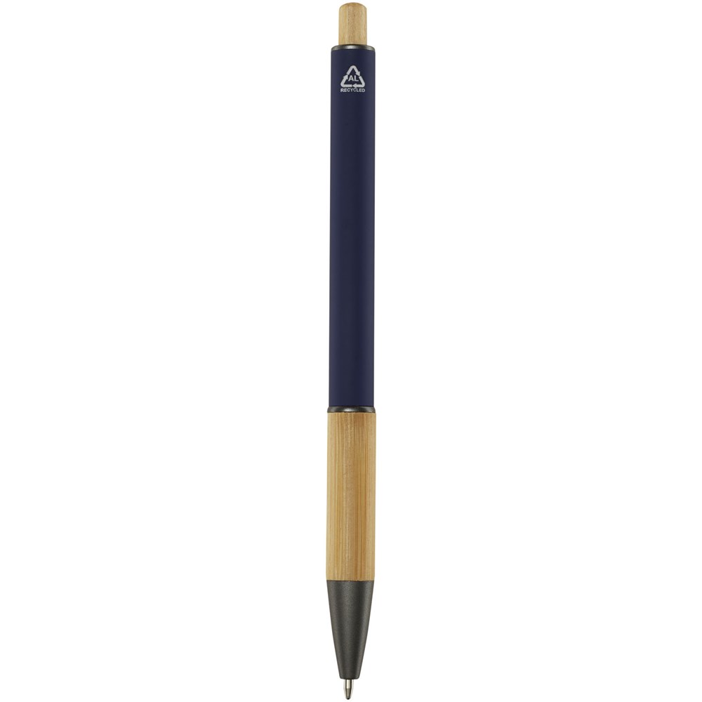 Der Darius Kugelschreiber wird aus recyceltem Aluminium hergestellt, was weniger Energie benötigt als die Herstellung von Aluminium aus Rohstoffen. Es reduziert außerdem die Abfallmenge auf Mülldeponien und trägt dazu bei, natürliche Ressourcen zu schonen und Treibhausgasemissionen zu reduzieren. Der Druckknopf und der untere Teil des Schafts sind aus Bambus gefertigt. Tintenfarbe: Schwarz. Schreiblänge: 800 Meter. Spitzengröße: 1,00 mm.