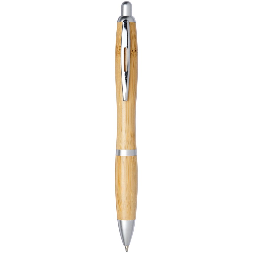 Kugelschreiber mit Klickmechanismus, mit einem Schaft aus Bambus, akzentuiert durch einen verchromten Clip und Verzierungen aus ABS-Kunststoff. Die Farbe des Bambusmaterials kann variieren.
