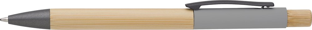 Kugelschreiber aus Bambus mit aluminiumfarbenen Details. Clip und Spitze aus Graphit, mit Bambusdetails an der Spitze. Blaue Tinte.