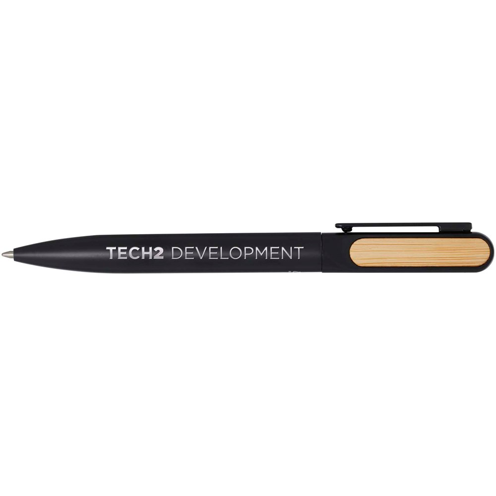 Der Blanca Kugelschreiber hat einen oberen Schaft aus recyceltem Kunststoff mit einer farbigen Sprühbeschichtung und Bambusaccessoires auf beiden Seiten. Der untere Teil des Schafts besteht aus recyceltem Aluminium mit einer farbigen Pulverbeschichtung. Tintenfarbe: Schwarz. Schreiblänge: 400 Meter. Strichstärke: 1,0 mm.
