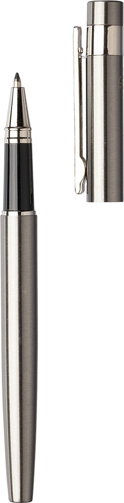 Recyceltes Stahl-Schreibset, bestehend aus einem Twist-Kugelschreiber und einem Rollerball-Stift, beide mit blauer Tinte. Enthält ein Logo aus recyceltem Edelstahl auf der Rückseite beider Stifte. Zusammen verpackt in einer Kraftpapier-Geschenkbox.