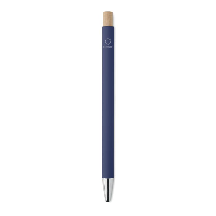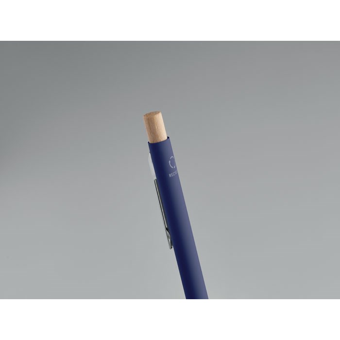 Druckkugelschreiber aus recyceltem Aluminium mit Druckknopf aus Bambus. Silberne Spitze und Clip. Blaue Tinte.