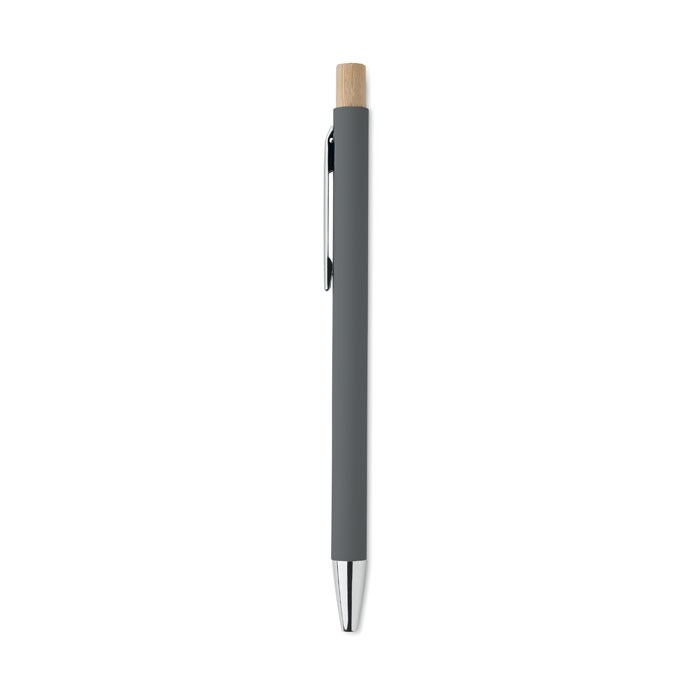 Druckkugelschreiber aus recyceltem Aluminium mit Druckknopf aus Bambus. Silberne Spitze und Clip. Blaue Tinte.