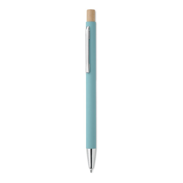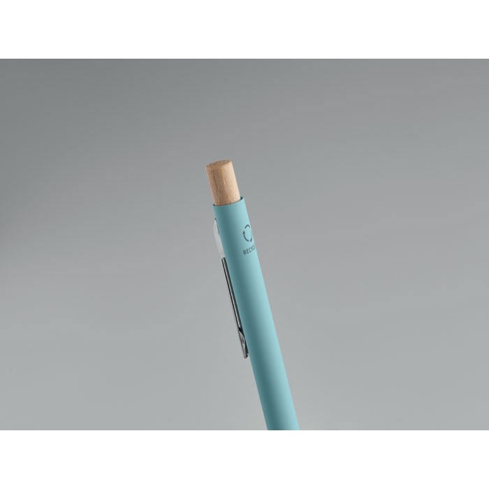 Druckkugelschreiber aus recyceltem Aluminium mit Druckknopf aus Bambus. Silberne Spitze und Clip. Blaue Tinte.