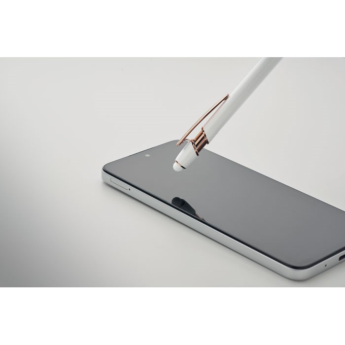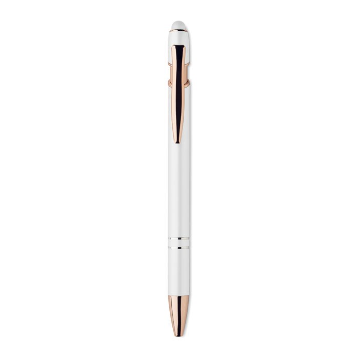 Druckkugelschreiber mit Stylus aus recyceltem Aluminium mit rosé goldenen Details. Blaue Tinte.