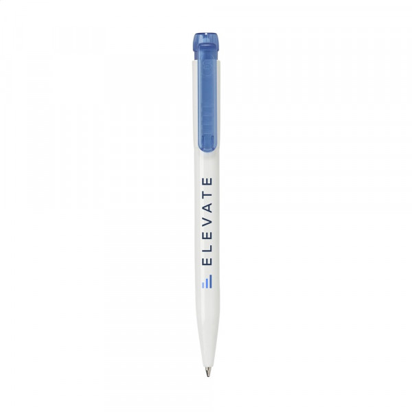 Blauschreibender Kugelschreiber der Marke Stilolinea®. Mit transparentfarbenem Clip/Druckknopf.... mehr