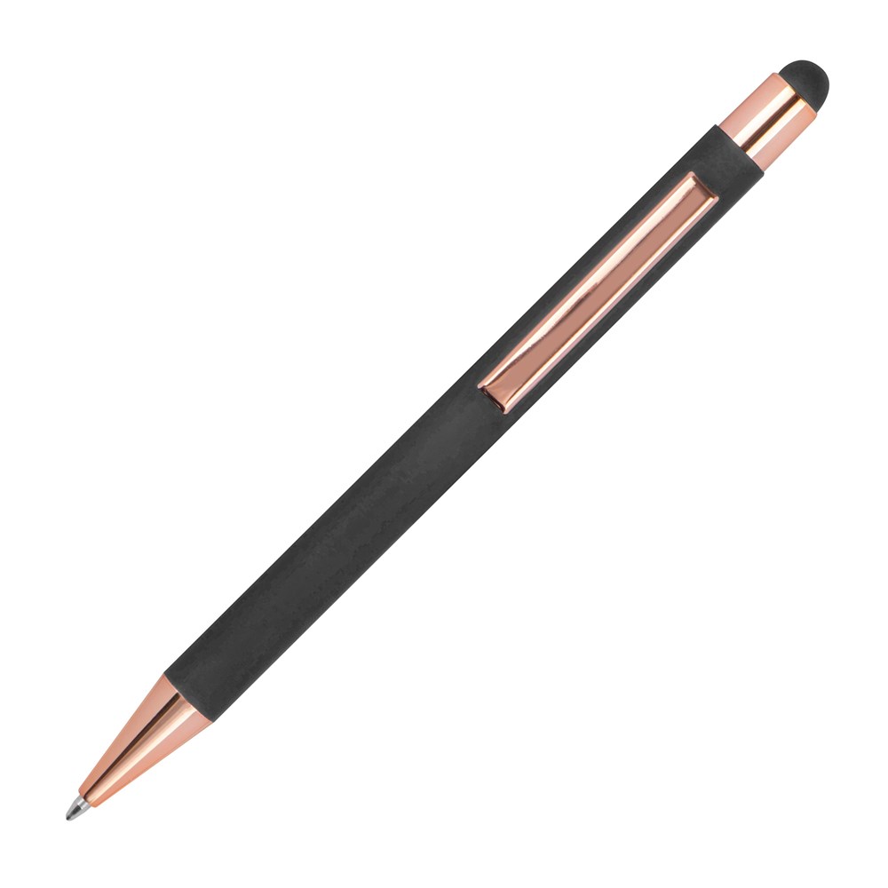 Kugelschreiber aus Aluminium mit rubber finish Oberfläche, roségoldenen Applikationen und Touch-Pen. Ausgestattet ist er mit einer blauschreibenden Kunststoffgroßraummine. Ihr Werbung bringen wir mittels einer Lasergravur unterhalb vom Clip an.