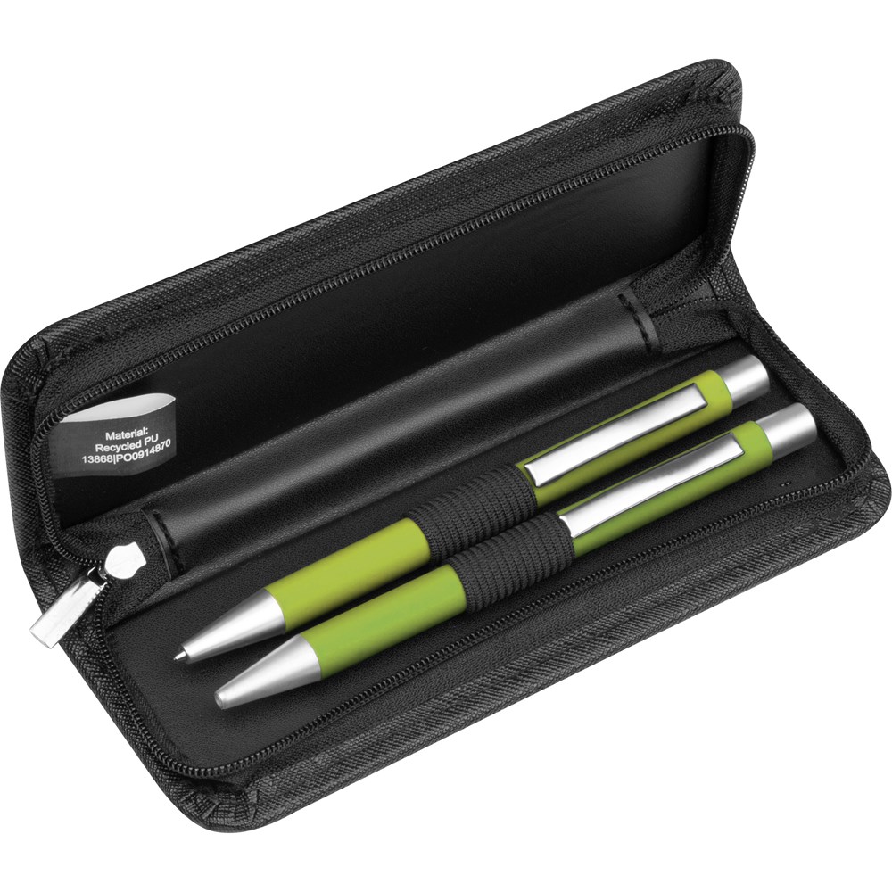 Schreibset bestehend aus einem blauschreibenden Metall-Kugelschreiber mit einer Kunststoffgroßraummine und einem passenden Druckbleistift mit zwei Bleistiftminen (0,5 mm). Beide Stifte verfügen über eine rubber finish Oberfläche die für eine angenehme Hapitk sorgt, das Etui besteht aus recyceltem PU. Ihre Werbung drucken wir auf das Etui. Gravur auf den Stiften auf Anfrage möglich.