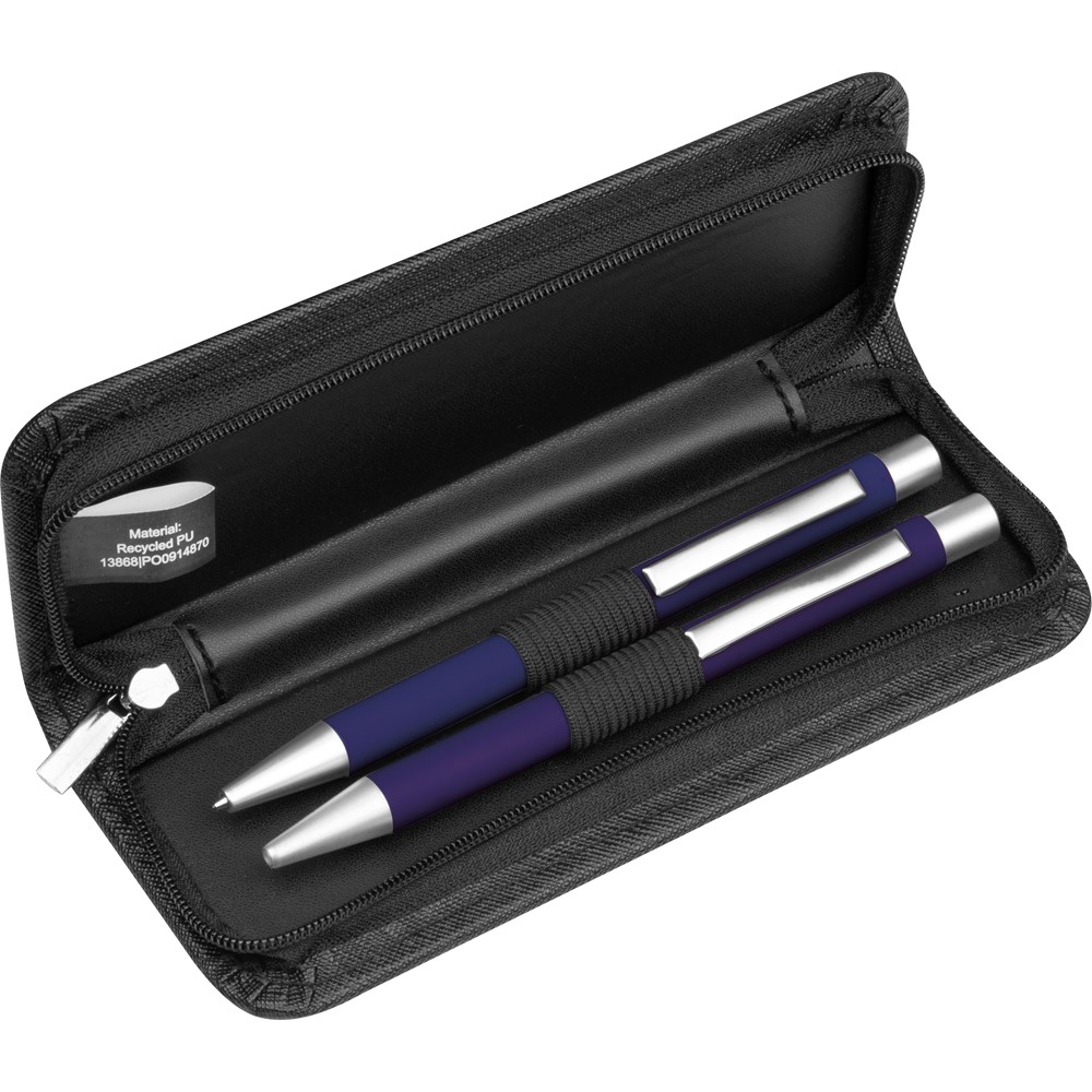 Schreibset bestehend aus einem blauschreibenden Metall-Kugelschreiber mit einer Kunststoffgroßraummine und einem passenden Druckbleistift mit zwei Bleistiftminen (0,5 mm). Beide Stifte verfügen über eine rubber finish Oberfläche die für eine angenehme Hapitk sorgt, das Etui besteht aus recyceltem PU. Ihre Werbung drucken wir auf das Etui. Gravur auf den Stiften auf Anfrage möglich.