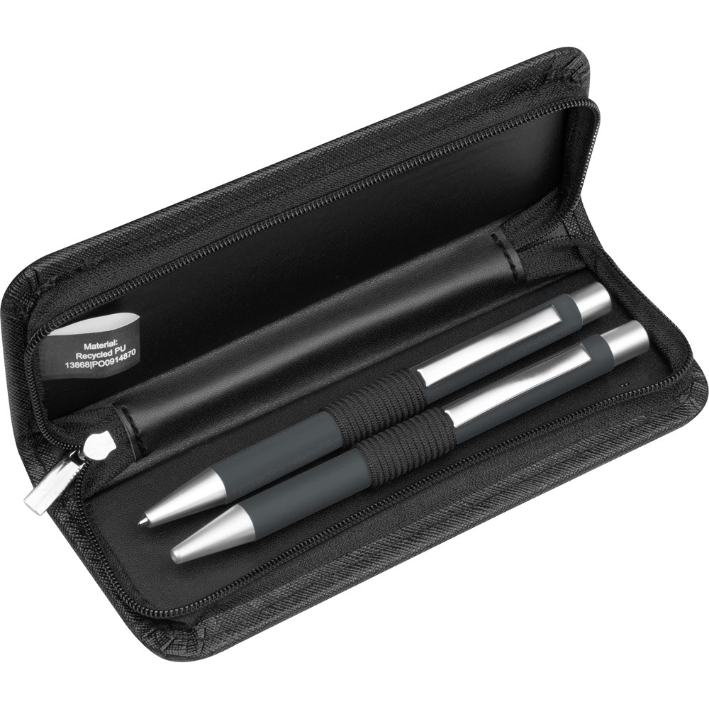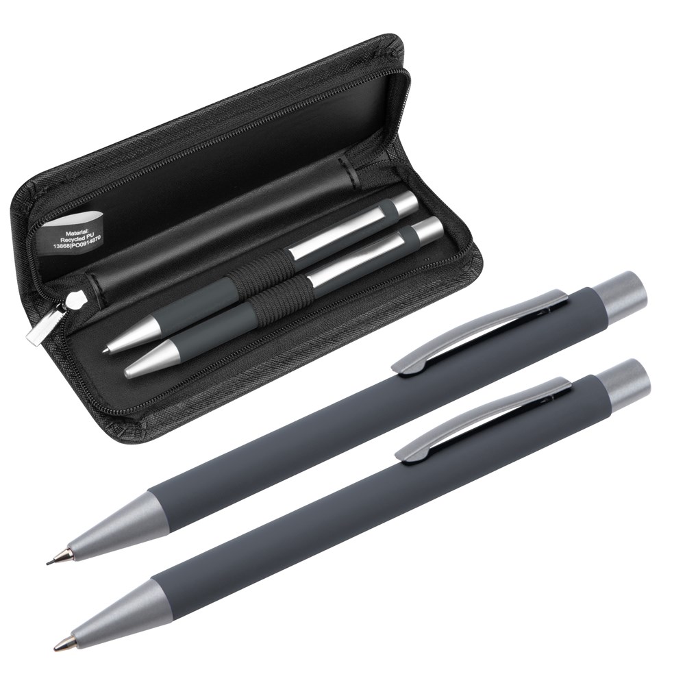 Schreibset bestehend aus einem blauschreibenden Metall-Kugelschreiber mit einer Kunststoffgroßraummine und einem passenden Druckbleistift mit zwei Bleistiftminen (0,5 mm). Beide Stifte verfügen über eine rubber finish Oberfläche die für eine angenehme Hapitk sorgt, das Etui besteht aus recyceltem PU. Ihre Werbung drucken wir auf das Etui. Gravur auf den Stiften auf Anfrage möglich.