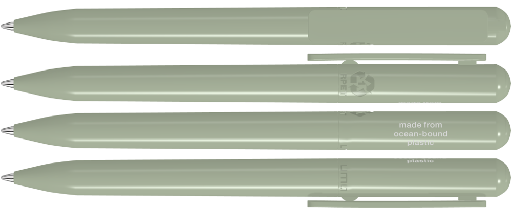 Drehkugelschreiber aus recyceltem PET-Material aus Ocean Bound Plastic mit gedeckt glänzendem Gehäuse. Das durch Plastic Bank gesammelte Ocean Bound Plastic, auch bekannt als Social Plastic®, wird in Europa zu einem recycelten PET Schreibgerät für einen langlebigen und nachhaltigen Werbeeinsatz upgecycelt.