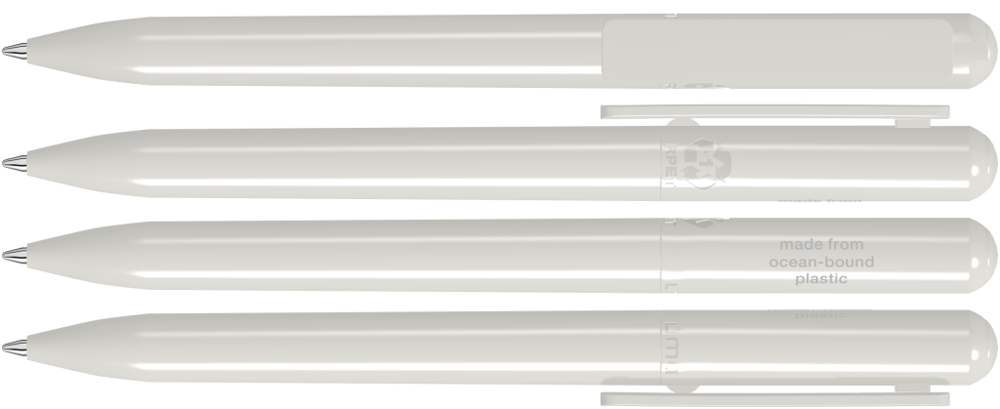 Drehkugelschreiber aus recyceltem PET-Material aus Ocean Bound Plastic mit gedeckt glänzendem Gehäuse. Das durch Plastic Bank gesammelte Ocean Bound Plastic, auch bekannt als Social Plastic®, wird in Europa zu einem recycelten PET Schreibgerät für einen langlebigen und nachhaltigen Werbeeinsatz upgecycelt.