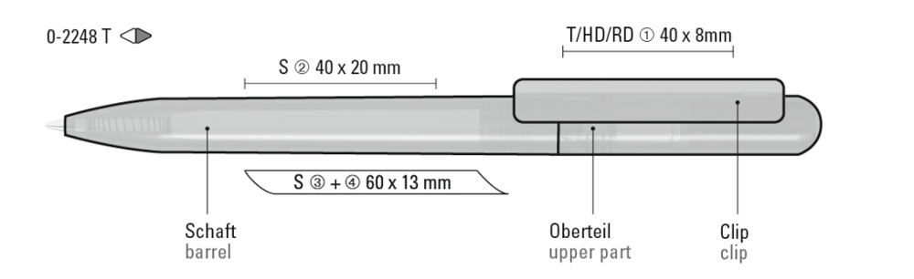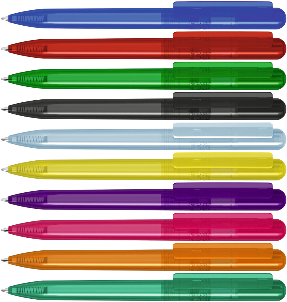 Drehkugelschreiber aus recyceltem PET-Material mit transparent glänzendem Gehäuse.