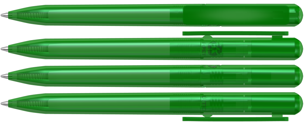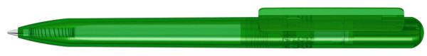 Drehkugelschreiber aus recyceltem PET-Material mit transparent glänzendem Gehäuse.