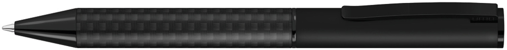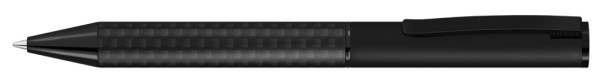 Metall-Drehkugelschreiber mit Schaft aus Carbonfaser in schwarz, Softdrehmechanik und gefedertem Metallclip. Beschlagteile schwarz matt lackiert.