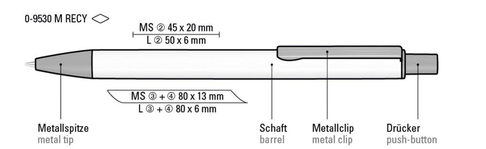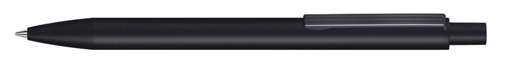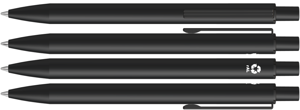 Metall-Druckkugelschreiber mit matter Oberfläche aus recyceltem Aluminium. Metallclip mit eingelassenen Rillen, Metallspitze und Drücker in schwarz matt.