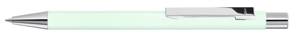 Metall-Druckkugelschreiber mit Softtouch-Gehäuse, Metallclip, Metallspitze und Drücker silber glänzend.