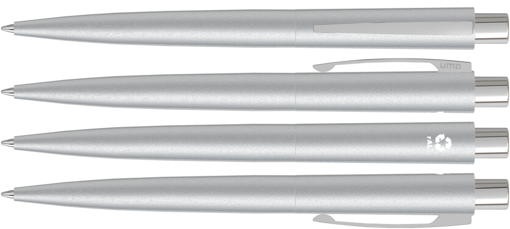 Metall-Druckkugelschreiber mit matt lackiertem Gehäuse aus recyceltem Aluminium. Metallclip und Drücker glanzverchromt.
