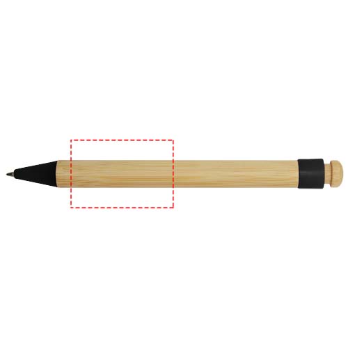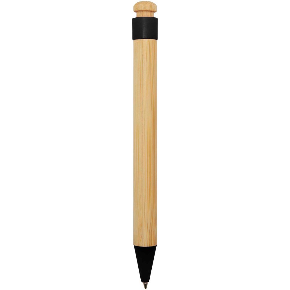 Kugelschreiber mit Clip und Spitze aus recyceltem Kunststoff, Knopf und Schaft aus Bambus. Tintenfarbe: Schwarz. Schreiblänge: 1000 Meter. Schreibspitze: 1,0 mm.