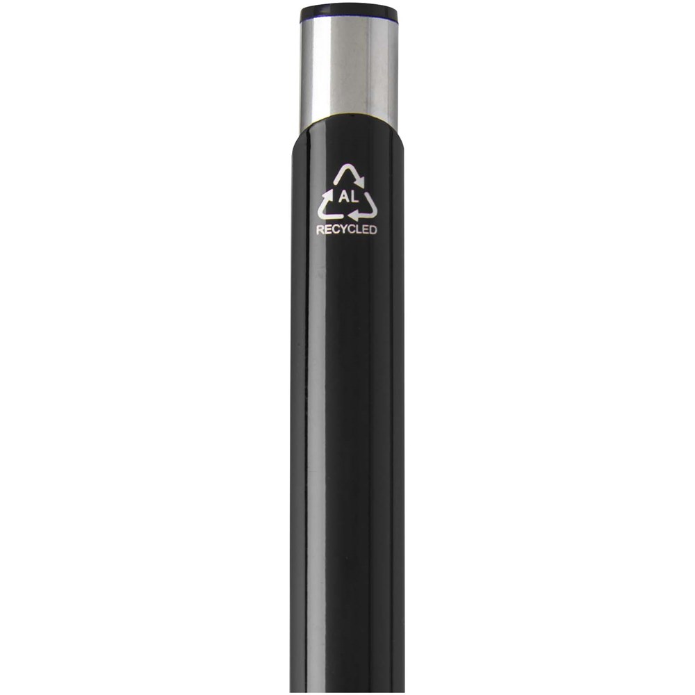 Kugelschreiber aus recyceltem Aluminium in lackierter Ausführung, poliert, glänzend, mit markanten Chromdetails. Recyceltes Aluminium reduziert die Menge an Deponiemüll, schont die natürlichen Ressourcen und reduziert die Treibhausgasemissionen. Tintenfarbe: Blau. Schreiblänge: 1000 Meter. Schreibspitze: 1 mm.
