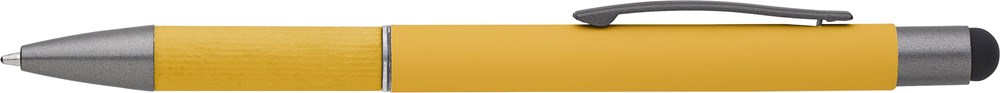 Aluminiumkugelschreiber mit Details aus gerolltem Papier am Griff. Gummispitze für kapazitive Bildschirme. Blaue Tinte.