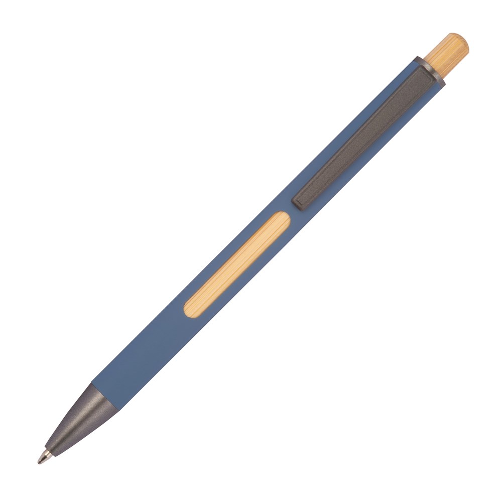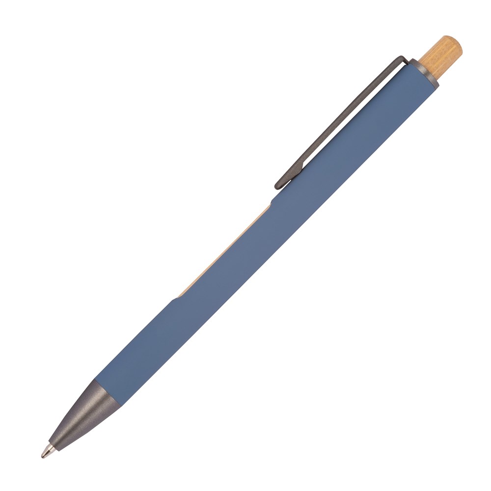 Unser Kugelschreiber aus recyceltem Aluminium verbindet modernes Design mit funktionalen Details und natürlichen Akzenten. Mit einem schwarzen Metallclip, einem eleganten Bambusdrücker und einem auffälligen, 6-fach wechselnden Bambusfenster nahe des Clips, bietet dieser Stift nicht nur Komfort, sondern auch ein stilvolles Erscheinungsbild. Die blau schreibende Mine sorgt für ein angenehmes und flüssiges Schreibgefühl. Ihre Werbung wird neben dem Clip graviert, auf Wunsch auch auf die Bambusfläche.