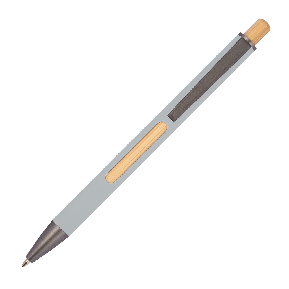 Unser Kugelschreiber aus recyceltem Aluminium verbindet modernes Design mit funktionalen Details und natürlichen Akzenten. Mit einem schwarzen Metallclip, einem eleganten Bambusdrücker und einem auffälligen, 6-fach wechselnden Bambusfenster nahe des Clips, bietet dieser Stift nicht nur Komfort, sondern auch ein stilvolles Erscheinungsbild. Die blau schreibende Mine sorgt für ein angenehmes und flüssiges Schreibgefühl. Ihre Werbung wird neben dem Clip graviert, auf Wunsch auch auf die Bambusfläche.