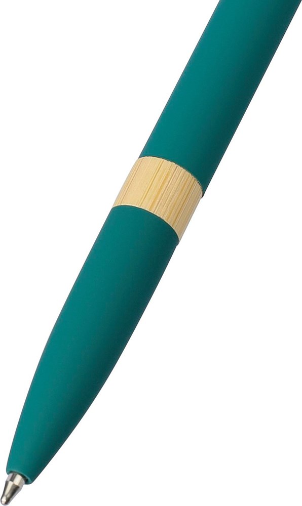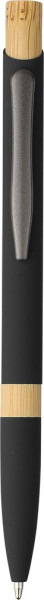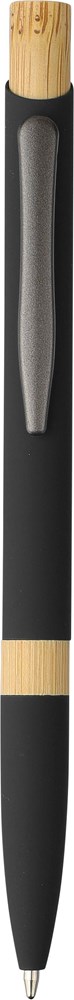Kugelschreiber aus recyceltem Aluminium mit gummierter Oberfläche, Drücker aus Bambus und Bambusring im Gehäuse. Mit Druckmechanik, 1,0 mm Mine und blauer Tinte mit einer Minenlänge von ca. 800 m. Mit graviertem Reycling-Logo.