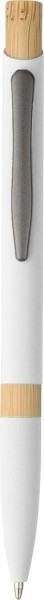 Kugelschreiber aus recyceltem Aluminium mit gummierter Oberfläche, Drücker aus Bambus und Bambusring im Gehäuse. Mit Druckmechanik, 1,0 mm Mine und blauer Tinte mit einer Minenlänge von ca. 800 m. Mit graviertem Reycling-Logo.