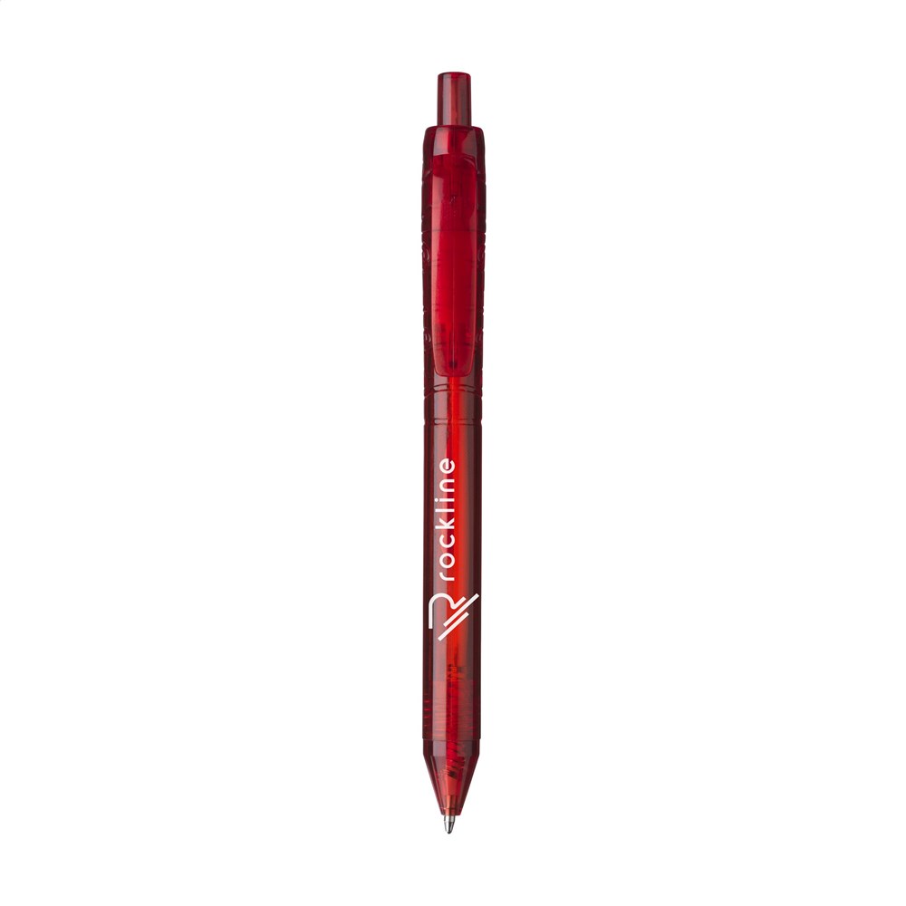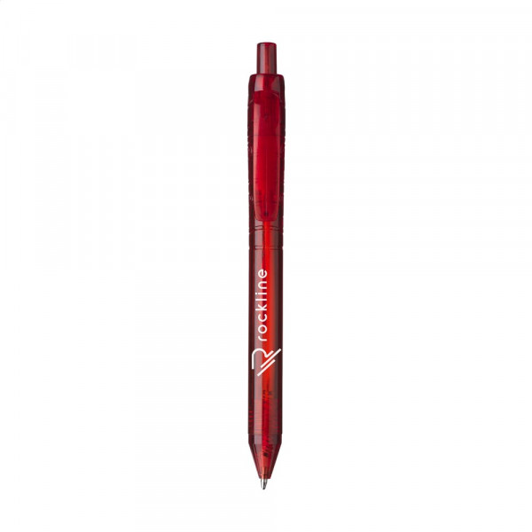 Blauschreibender Kugelschreiber mit transparantem Gehäuse hergestellt aus 100% recyceltem PET. GRS-zertifiziert.