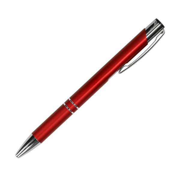 Blauschreibend. Eleganter Kugelschreiber mit Druckknopf und Metall-Clip. Das metallisch schimmernde Gehäuse in diversen Farben wirkt durch die beiden silbernen Trennlinien besonders stilvoll.