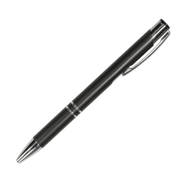 Blauschreibend. Eleganter Kugelschreiber mit Druckknopf und Metall-Clip. Das metallisch schimmernde Gehäuse in diversen Farben wirkt durch die beiden silbernen Trennlinien besonders stilvoll.