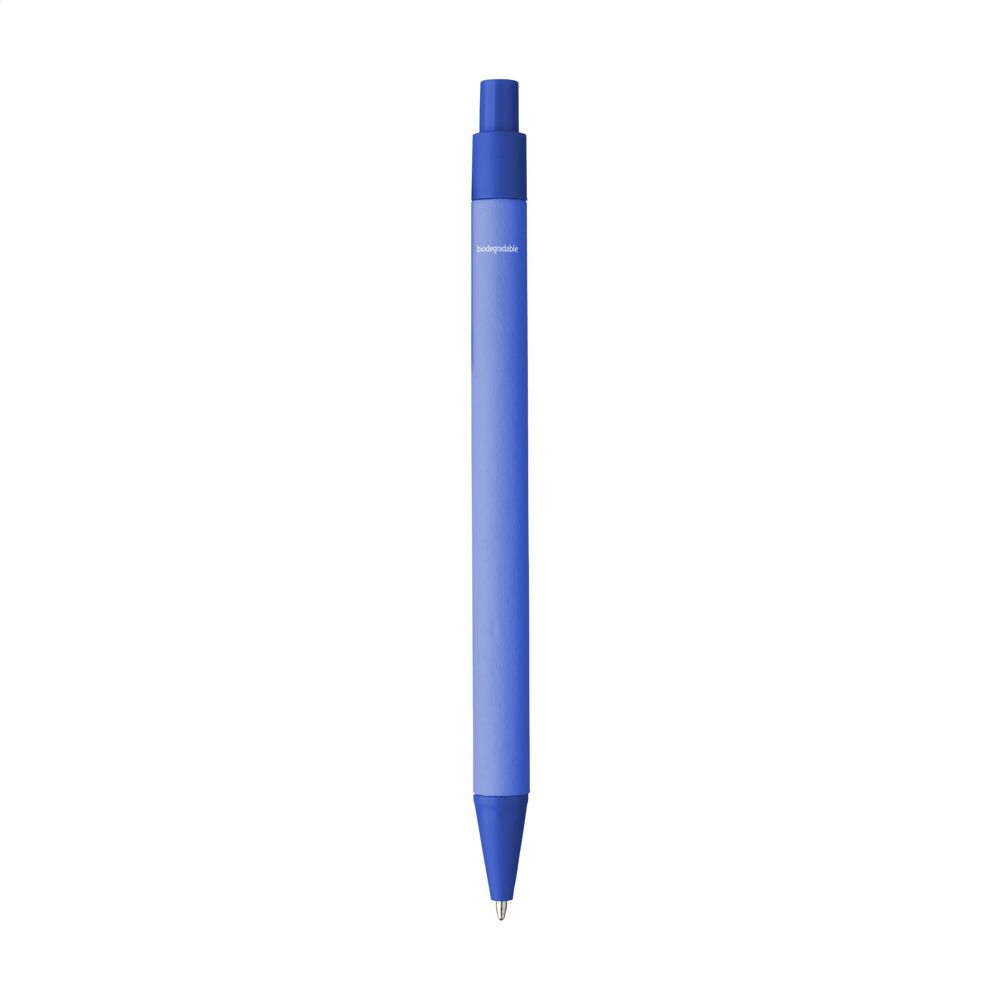 Blauwchreibender Kugelschreiber mit Halter aus Recyclingpapier. Der Clip, der Druckknopf und die Spitze bestehen aus biologisch abbaubarem PLA.